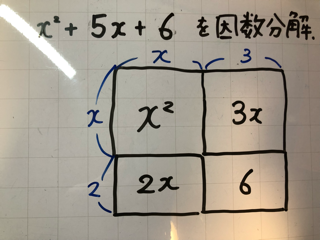 x²=x×x、3x=3×x、2x=2×x、6=2×3であることを利用し、面積図として表現しました。指導した当日はほかの問題においても、生徒が面積図を描いて因数分解することができていました。